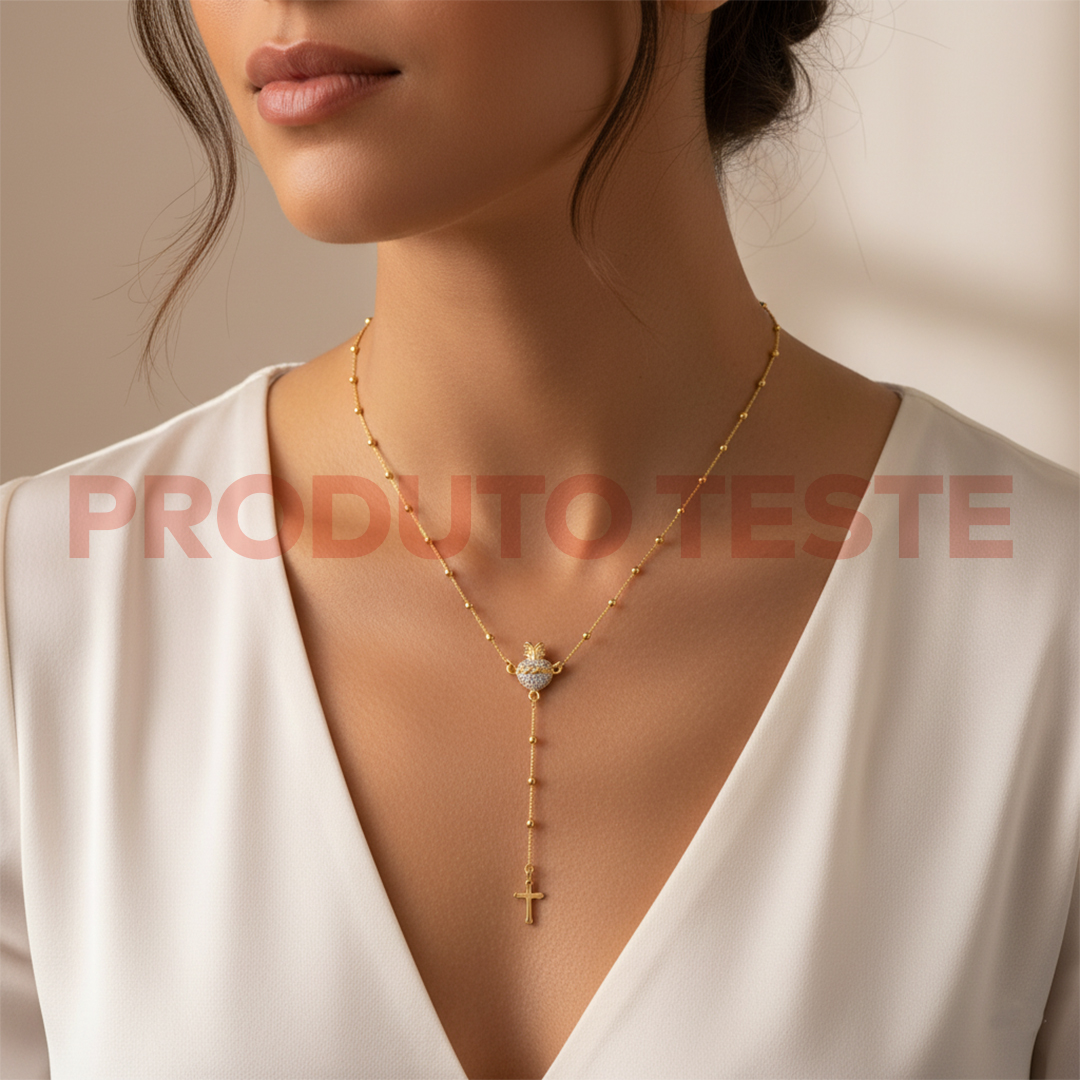 O Colar Terço Sagrado Coração folheado a ouro oferece elegância e significado em uma peça única. Com 60 cm de comprimento, possui o símbolo do Sagrado Coração cravejado com microzircônias, que garantem brilho e destaque. A corrente delicada com pingentes em formato de contas e a cruz ao final complementam a composição, trazendo espiritualidade com design refinado. Este colar é ideal para quem busca um acessório religioso com acabamento sofisticado e resistente, perfeito para uso diário.